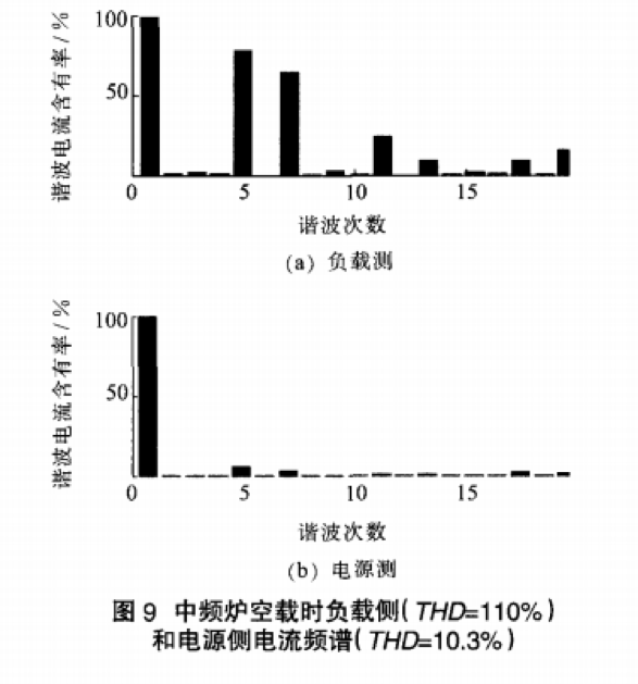 仿真分析結果驗證了理論上的諧波分析中頻爐采用6脈波整流電路,通過(guò)FFT分析得知輸入側電流中含有大量的6±1次諧波,其中5次諧波含量很大.