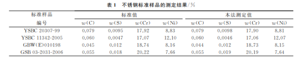 選?。磦€(gè)不銹鋼標準樣品,按本方法分析步驟進(jìn)行測定,結果如表1所示。