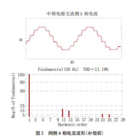 中頻爐注入電網(wǎng)的諧波主要是由于中頻電源的 整流裝置產(chǎn)生的,工業(yè)應用中常見(jiàn)的中頻電源整流 部分為三相橋式整流電路。由以下分析知,三相橋 式整流電路產(chǎn)生的諧波次數為 6k ± 1(k 為正整數) 次。為了減少諧波次數,本文中的整流部分采用了 由兩個(gè)三相橋式電路構成12相整流電路。假設交流 側電抗為零,而直流電感 Ld 視為無(wú)窮大。 橋Ⅰ的閥側線(xiàn)電流與其感應的網(wǎng)側線(xiàn)電流相 同,即iIA=iIa,且電流中僅含6k±1(k為正整數)次 諧波,各次諧波的有效值和諧波次數成反比,且與 基波有效值的比值為諧波次數的倒數。同理,橋Ⅱ 閥側線(xiàn)電壓比橋Ⅰ超前 30°,因而其閥側線(xiàn)電流比 橋Ⅰ超前 30°。 兩個(gè)整流橋產(chǎn)生的5、7、11、19、…次諧波相 互抵消,注入電網(wǎng)的只有12k±1(k為正整數)次諧波, 且有效值與諧波次數成反比,而與基波有效值的比 值為諧波次數的倒數,波形與頻譜如圖 2 所示
