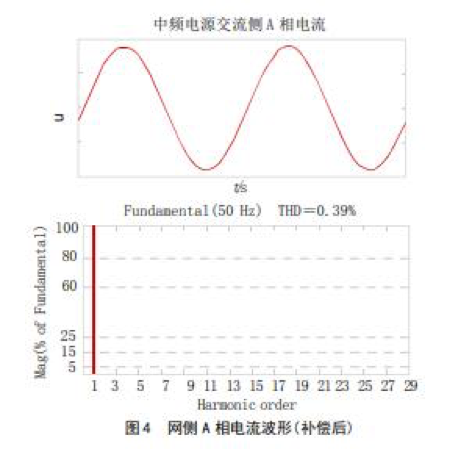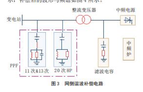 中頻爐諧波的補償可以通過(guò)安裝濾波器來(lái)治理。 根據濾波器結構和原理,可將其分為有源濾波和無(wú) 源濾波兩種方式。有源濾波器(APF)本身也是一種電 力電子裝置,它能對大小和頻率都變化的諧波以及 變化的無(wú)功進(jìn)行補償。其基本原理是從補償對象中 檢測出諧波電流,然后產(chǎn)生一個(gè)與諧波電流大小相等而極性相反的補償電流與電網(wǎng)提供的電流疊加, 從而使注入電網(wǎng)的總的電流只含基波分量。無(wú)源濾 波器( PPF)是由電容器、電抗器和電阻通過(guò)串并聯(lián)結 合組成的一種補償裝置,其基本原理是通過(guò)電容電 抗諧振時(shí)的低阻抗特性來(lái)吸收諧波,從而達到濾波 的目的。有源濾波器的濾波效果要優(yōu)于無(wú)源濾波器, 適用于諧波成分復雜,諧波量變化較大的環(huán)境使用, 但其結構復雜,價(jià)格昂貴,維護成本也比較高。無(wú)源 濾波器具有投資少,結構簡(jiǎn)單的特點(diǎn),同時(shí)還兼有 無(wú)功補償的作用。但濾波效果受系統和負荷變化的影響較大,可能在一些情況下還會(huì )引起諧波電流放 大。由于中頻爐諧波電流產(chǎn)生的特點(diǎn),本文采用了 無(wú)源濾波器對中頻電爐其整流裝置的諧波進(jìn)行補償,如圖3所 示,補償后的波形與頻譜如圖 4 所示